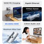 - Multifunctional, multi-port desktop clip-on docking station supporting 100W PD fast charging, Gigabit Ethernet, 4K@60Hz HDMI display output, 3.5mm headphone/microphone jack for external audio devices, and file transfer speeds of up to 10Gbps